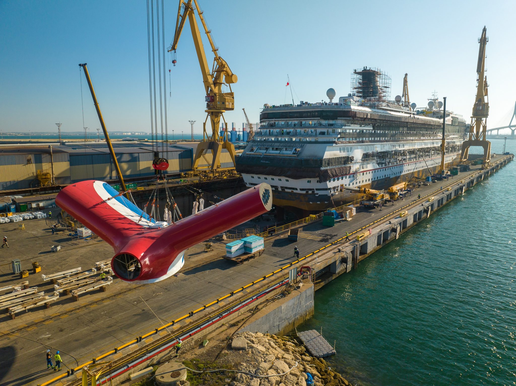 Thanks to its strategic location between European and Caribbean routes, excellent climate and specialised auxiliary industry in the area, Navantia Cádiz offers a comprehensive service for large‑scale works, with capacity to store up to 800 containers and a 1,000 m² covered warehouse available to shipowners. In recent years, it has signed fleet agreements with major companies in the sector and has repaired or modernised vessels of Royal Caribbean International, Disney Cruises, Norwegian Cruise Line and Pullmantur.