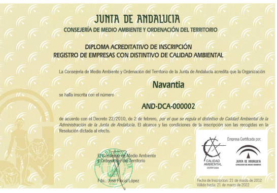 Navantia is certified to ISO 14001:2015, an international standard that endorses its commitment to responsible environmental management. This certification applies to all its production hubs, including the sites in the Bay of Cadiz, the Ferrol Estuary and the Cartagena Dockyard, ensuring that each facility implements effective environmental management systems in line with the highest international standards. This commitment also extends to its head offices in Madrid, thereby reinforcing an environmental policy integrated throughout the organisation. This accreditation demonstrates Navantia’s strong commitment to sustainability, continuous improvement and respect for the environment in the development of its industrial activities.